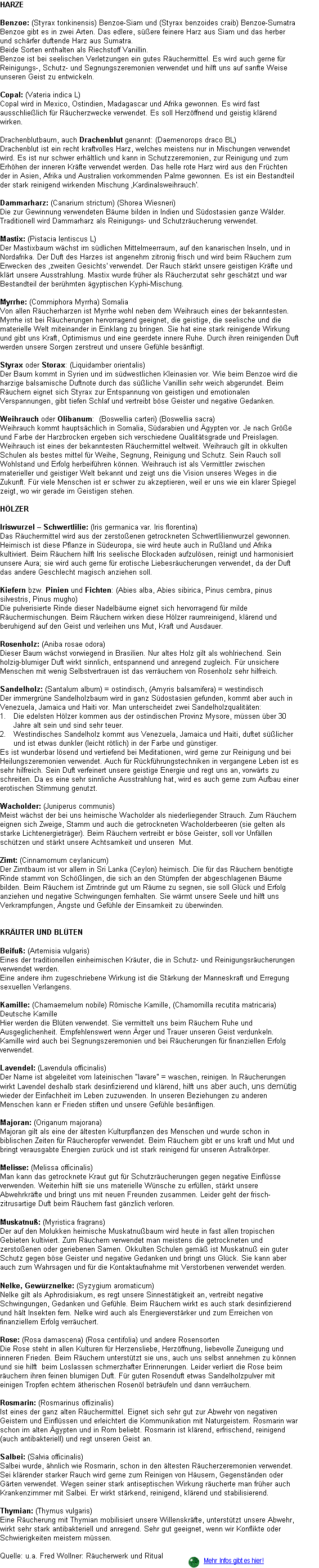 Harz: Benzoe, Copal, Myrrhe, Olibanum (Weihrauch), Opoponax, Dammar